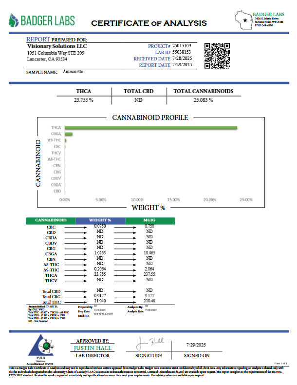 Amaretto opens with a rich, dessert-like aroma where sweet almond and cherry come forward first, followed by a smooth, nutty finish that stays clean on the exhale. This strain was selected for balance, flavorful enough to savor, yet smooth enough to enjoy consistently.